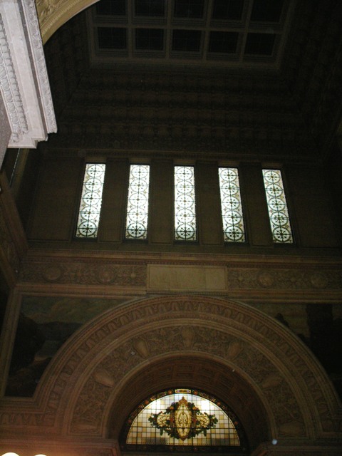 4階までの吹き抜けで、ステンドグラスや壁画が描かれ歴史的建造物だと実感させられる場所です。